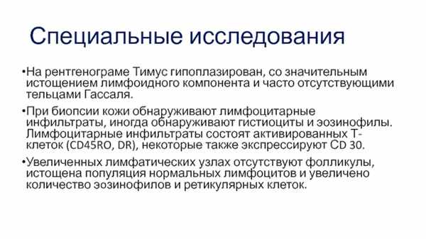 На рентгенограме Тимус гипоплазирован, со значительным истощением лимфоидного компонента и часто отсутствующими тельцами Гассаля.