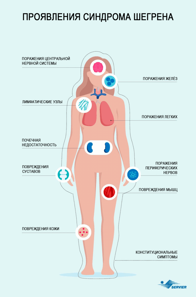 У 30% пациентов наблюдается системное поражение – то есть от синдрома страдают и другие органы, такие как лимфатические узлы, кожа, легкие, почки, кровеносные сосуды, а также периферическая и/или центральная нервная система. 4