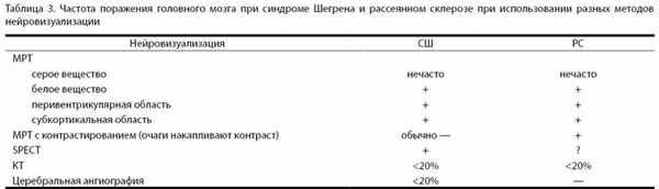 МРТ головного мозга у пациентов с СШ и поражением ЦНС могут иметь схожую с РС нейровизуализационную картину (табл. 3). Примерно ⅔ больных с СШ с острым поражением ЦНС характеризуются наличием множественных участков гиперинтенсивного сигнала на Т2- и протонно-взвешенных изображениях головного мозга [4, 5, 33].