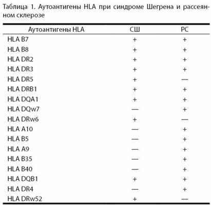 Аутоиммунные механизмы имеют большое значение в патогенезе СШ и РС (табл. 1). СШ и РС - заболевания, которые ассоциируются с генами HLA класса II главного комплекса гистосовместимости. Обращает на себя внимание наличие множественных ассоциаций с генами HLA при этих заболеваниях, что свидетельствует, с одной стороны, об их мультифакториальном генезе, а с другой - об их возможной генетической неоднородности. Этот локус является единственной полиморфной генетической системой, связь которой с аутоиммунными заболеваниями была убедительно показана благодаря многолетним популяционным исследованиям [3, 7, 8, 10, 11, 18, 21, 27, 29, 30, 32, 34, 41, 44-46, 54].