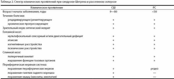 СШ - системное аутоиммунное заболевание неизвестной этиологии, характеризующееся лимфоплазмоклеточной инфильтрацией секретирующих эпителиальных желез с наиболее частым поражением слюнных и слезных желез [2, 28]. У больных c первичным СШ в сыворотках обнаруживаются различные антитела. Неврологические проявления при СШ очень часто схожи с клинической картиной РС. При обоих заболеваниях у пациентов могут выявляться гипестезия, спастичность, гиперрефлексия, атаксия, корешковые нарушения, гемипарезы или гемиплегия, дизартрия, мозжечковые нарушения речи, нистагм, межъядерная офтальмоплегия и др. У пациентов с СШ с поражением спинного мозга могут развиться нижний парапарез, тетрапарезы, острая или подострая поперечная миелопатия, хроническая прогрессирующая миелопатия, нейрогенный мочевой пузырь, нарушения функции тазовых органов, синдром Броун-Секара. Если у больных с СШ в патологический процесс будет вовлечен зрительный нерв, то может быть монокулярная или бинокулярная потеря зрения или неврит/нейропатия зрительного нерва. Некоторые симптомы поражения ЦНС представлены как при РС, так и при СШ (табл. 2).