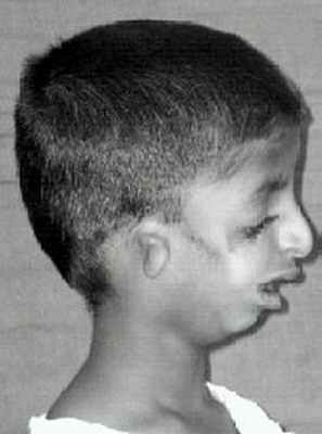 Тот же ребенок, показанный спереди вверху в информационном окне, теперь виден сбоку, с маленькими ушами и подбородком, который находится далеко позади.