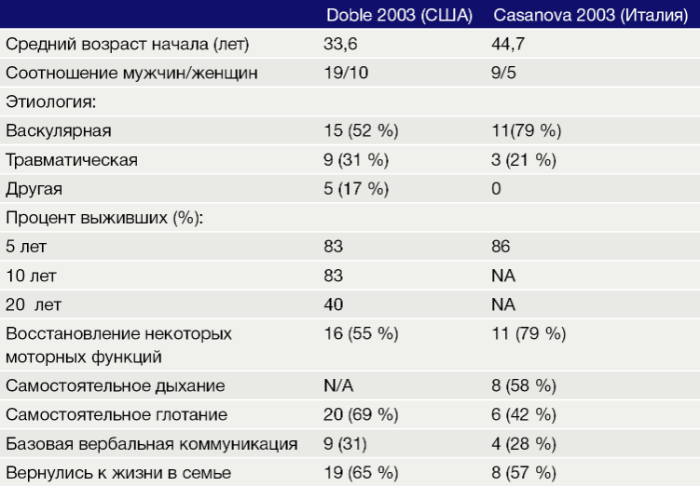 В таблице представлены результаты двух исследований, оценивающих продолжительность жизни пациентов с синдромом запертого человека, и процент пациентов, восстановивших некоторые моторные функции [4, 5].