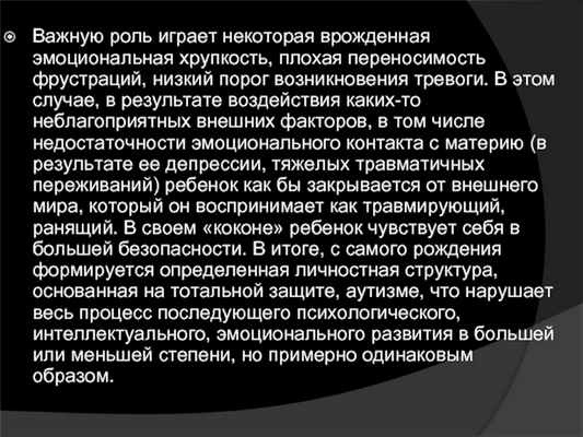 Важную роль играет некоторая врожденная эмоциональная хрупкость, плохая переносимость фрустраций, низкий порог возникновения тревоги. В этом случае, в результате воздействия каких-то неблагоприятных внешних факторов, в том числе недостаточности эмоционального контакта с материю (в результате ее депрессии, тяжелых травматичных переживаний) ребенок как бы закрывается от внешнего мира, который он воспринимает как травмирующий, ранящий. В своем «коконе» ребенок чувствует себя в большей безопасности. В итоге, с самого рождения формируется определенная личностная структура, основанная на тотальной защите, аутизме, что нарушает весь процесс последующего психологического, интеллектуального, эмоционального развития в большей или меньшей степени, но примерно одинаковым образом.