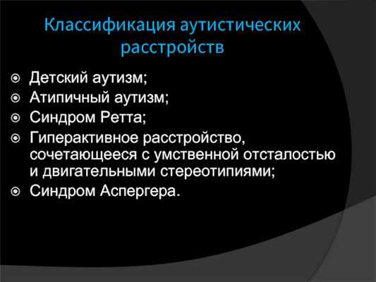 Накопленный за прошедшее десятилетие клинический материал о структуре аутизма, его клинике, об аутистическиподобных расстройствах хромосомного, обменного генеза, синдроме Ретта, парааутизме делает возможным предложить новую классификацию аутизма в детстве, апробированную в НЦПЗ РАМН, на основе клинико-нозологических, биологических подходов.