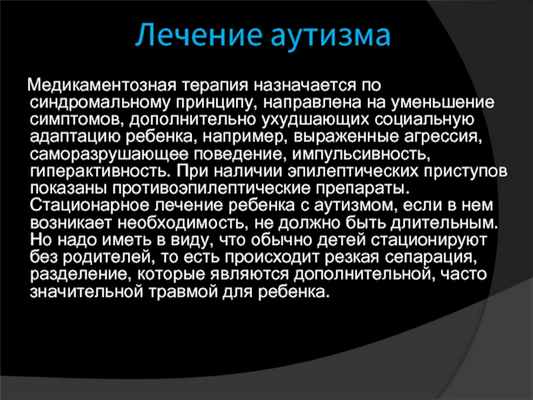 Медикаментозная терапия назначается по синдромальному принципу, направлена на уменьшение симптомов, дополнительно ухудшающих социальную адаптацию ребенка, например, выраженные агрессия, саморазрушающее поведение, импульсивность, гиперактивность. При наличии эпилептических приступов показаны противоэпилептические препараты. Стационарное лечение ребенка с аутизмом, если в нем возникает необходимость, не должно быть длительным. Но надо иметь в виду, что обычно детей стационируют без родителей, то есть происходит резкая сепарация, разделение, которые являются дополнительной, часто значительной травмой для ребенка.