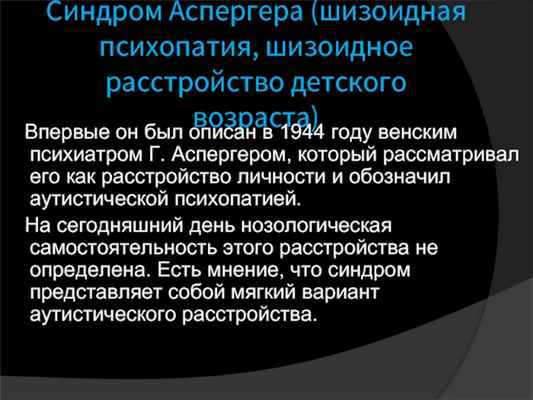 Впервые он был описан в 1944 году венским психиатром Г. Аспергером, который рассматривал его как расстройство личности и обозначил аутистической психопатией.