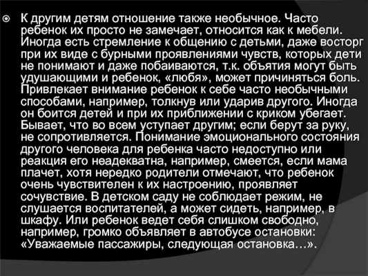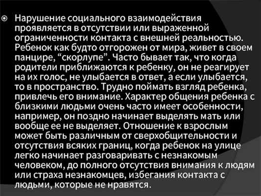 Нарушение социального взаимодействия проявляется в отсутствии или выраженной ограниченности контакта с внешней реальностью. Ребенок как будто отгорожен от мира, живет в своем панцире, “скорлупе”. Часто бывает так, что когда родители приближаются к ребенку, он не реагирует на их голос, не улыбается в ответ, а если улыбается, то в пространство. Трудно поймать взгляд ребенка, привлечь его внимание. Характер общения ребенка с близкими людьми очень часто имеет особенности, например, он поздно начинает выделять мать или вообще ее не выделяет. Отношение к взрослым может быть различным от сверхобщительности и отсутствия всяких границ, когда ребенок на улице легко начинает разговаривать с незнакомым человеком, до полного отсутствия внимания к людям или страха незнакомцев, избегания контакта с людьми, которые не нравятся.