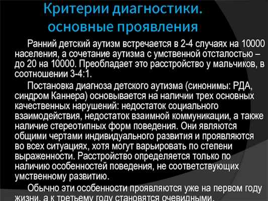 Постановка диагноза детского аутизма (синонимы: РДА, синдром Каннера) основывается на наличии трех основных качественных нарушений: недостаток социального взаимодействия, недостаток взаимной коммуникации, а также наличие стереотипных форм поведения. Они являются общими чертами индивидуального развития и проявляются во всех ситуациях, хотя могут варьировать по степени выраженности. Расстройство определяется только по наличию особенностей поведения, не соответствующих умственному развитию.