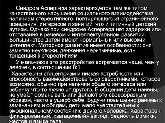 Синдром Аспергера характеризуется тем же типом качественного нарушения социального взаимодействия, наличием стереотипного, повторяющегося ограниченного поведения, интересов и занятий, что и типичный детский аутизм. Однако при синдроме Аспергера нет задержки или отставания в речевом и интеллектуальном развитии. Большинство детей имеют нормальный или высокий интеллект. Моторное развитие имеет особенности: они заметно неуклюжи, движения неритмичные, есть тенденция к стереотипиям