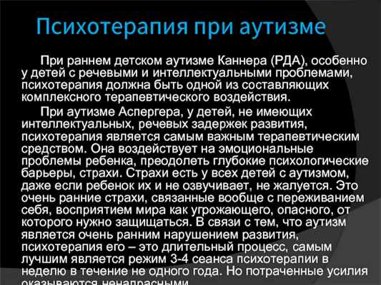 При раннем детском аутизме Каннера (РДА), особенно у детей с речевыми и интеллектуальными проблемами, психотерапия должна быть одной из составляющих комплексного терапевтического воздействия.