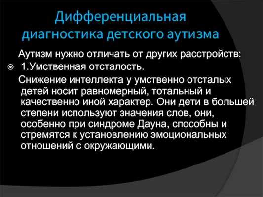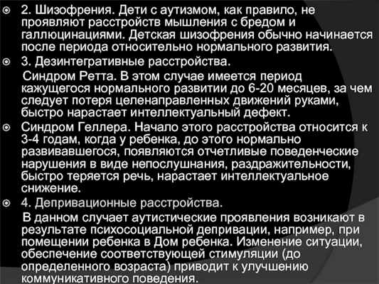 2. Шизофрения. Дети с аутизмом, как правило, не проявляют расстройств мышления с бредом и галлюцинациями. Детская шизофрения обычно начинается после периода относительно нормального развития.