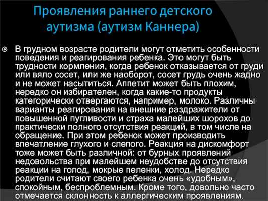 В грудном возрасте родители могут отметить особенности поведения и реагирования ребенка. Это могут быть трудности кормления, когда ребенок отказывается от груди или вяло сосет, или же наоборот, сосет грудь очень жадно и не может насытиться. Аппетит может быть плохим, нередко он избирателен, когда какие-то продукты категорически отвергаются, например, молоко. Различны варианты реагирования на внешние раздражители от повышенной пугливости и страха малейших шорохов до практически полного отсутствия реакций, в том числе на обращение. При этом ребенок может производить впечатление глухого и слепого. Реакция на дискомфорт тоже может быть различной: от бурных проявлений недовольства при малейшем неудобстве до отсутствия реакции на голод, мокрые пеленки, холод. Нередко родители считают своего ребенка очень «удобным», спокойным, беспроблемным. Кроме того, довольно часто отмечается склонность к аллергическим проявлениям.