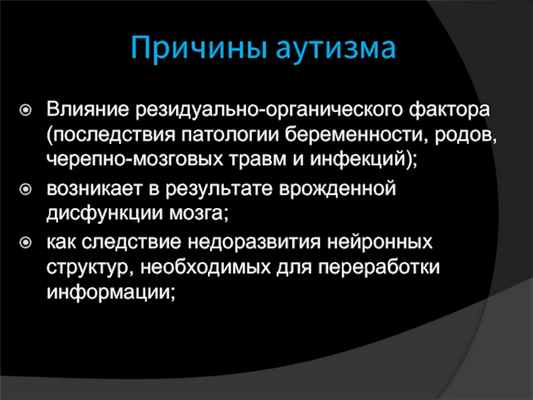 К сожалению, точная и единая причина развития аутизма пока не найдена. С момента появления нового заболевания врачи и ученые предполагали, что на развитие этого расстройства влияют многие факторы, однако после проведенных исследований большинство теорий оказалось недостоверными, и они были отвергнуты.
