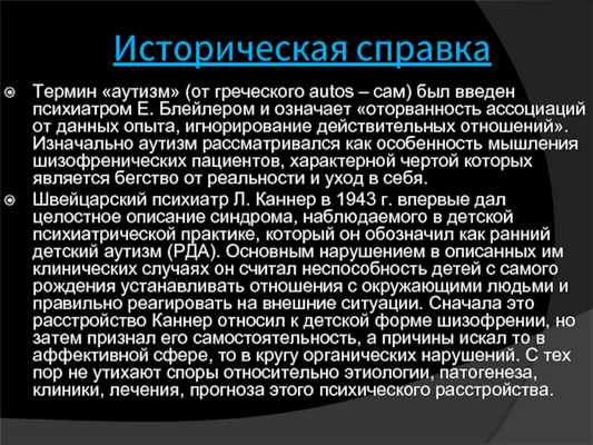 Термин «аутизм» (от греческого autos – сам) был введен психиатром Е. Блейлером и означает «оторванность ассоциаций от данных опыта, игнорирование действительных отношений». Изначально аутизм рассматривался как особенность мышления шизофренических пациентов, характерной чертой которых является бегство от реальности и уход в себя.