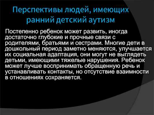 Постепенно ребенок может развить, иногда достаточно глубокие и прочные связи с родителями, братьями и сестрами. Многие дети в дошкольный период заметно меняются, улучшается их социальная адаптация, они могут не выглядеть детьми, имеющими тяжелые нарушения. Ребенок может лучше воспринимать обращенную речь и устанавливать контакты, но отсутствие взаимности в отношениях сохраняется.