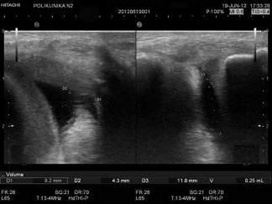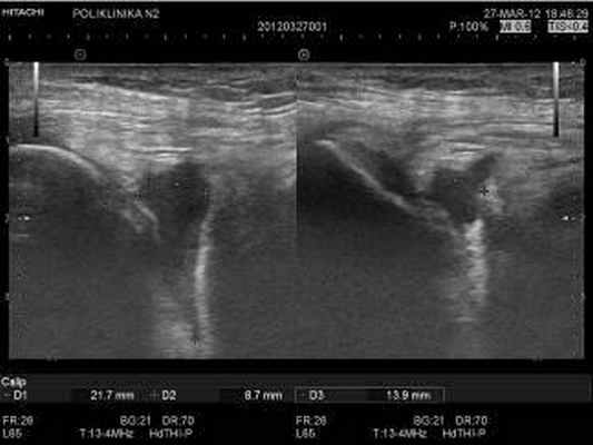 2. Дифференциация синовиальной оболочки в виде ее неравномерного утолщения, расслоения, отека иногда локального повышения эхогенности.