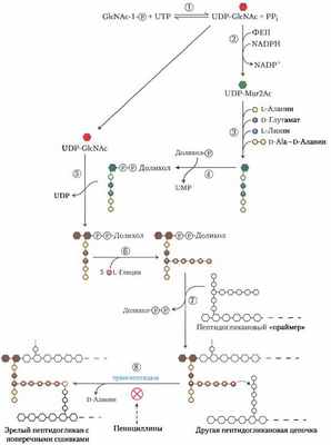Рис. 20-32. Синтез бактериального пептидогликана. На ранних стадиях этого пути (с (1) по (4)) N-ацетилглюкозамин (GlсNAс) и N-ацетилмурамовая кислота (Мur2Ас) активируются присоединением уридинового нуклеотида (UDР) к аномерному атому углерода, а в случае Мur2Ас длинноцепочечного изопреноидного спирта (долихола), через фосфодиэфирную связь. Эти активирующие группы участвуют в образовании гликозидных связей; они служат в качестве превосходных уходящих групп. После этого происходит ((5), (6)) ассоциация дисахарида с боковой пептидной цепью (10 аминокислотных остатков), (7) этот предшественник переносится на невосстанавливающий конец существующей пептидогликановой цепочки, которая служит праймером для реакции полимеризации. Наконец, (8) в транспептидазной реакции между боковыми пептидными цепями двух соседних молекул пептидогликана остаток Glу на конце одной цепи замещается D-Аlа другой цепи, образуя поперечные сшивки. Транспептидазная реакция ингибируется пенициллинами, которые убивают бактерии, разрушая их клеточную стенку.