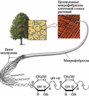Целлюлоза — главный компонент растительной клеточной стенки, который обеспечивает ее прочность, жесткость и предохраняет клетку от набухания, а также предотвращает разрывы цитоплазматической мембраны, которые могут произойти, если под действием осмотического давления внутрь клетки войдет слишком много воды. Ежегодно на Земле растения синтезируют более 10 11 т целлюлозы, что делает ее одним из самых распространенных соединений в биосфере. Целлюлоза имеет простое строение; ее линейная полимерная цепь состоит из тысяч остатков D-глюкозы, соединенных β (1 —> 4)-связями; полимерные цепи объединены в пучки из -36 параллельных друг другу нитей, которые образуют микрофибриллы (рис. 20-29).