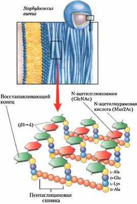 Рис. 20-31. Структура пептидогликана. Показан пептидогликан клеточной стенки грамположительной бактерии Staphylococcus aureus. Пептиды (последовательность из раскрашенных сфер) ковалентно связаны с остатком N-ацетилмурамовой кислоты соседней полисахаридной цепи. Обратите внимание на то, что пептиды образованы из смеси L- и D-аминокислот. Грамположительные бактерии, такие как 5. aureus, сшиты пентаглициновы- ми цепочками. Грамотрицательные бактерии, такие как Е. coli, не содержат пентаглицинов; вместо этого терминальный остаток D-Ala тетрапептида присоединен прямо к соседнему тетрапептиду либо через L-Lys, либо через похожую на лизин диаминопимелиновую кислоту. Образование пептидной связи с остатком глутамата здесь происходит необычно — через карбоксильную группу боковой цепи.
