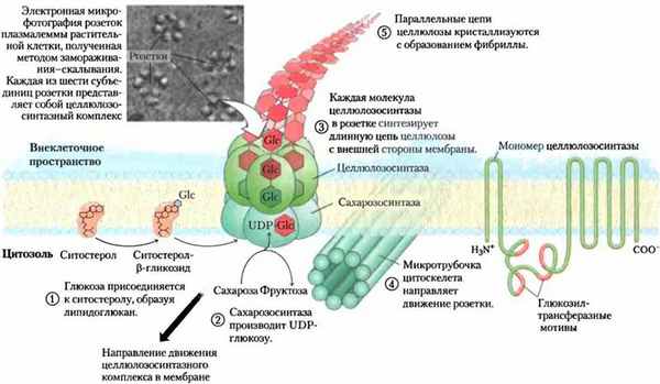 Каждая из шести глобул розетки состоит из многих белковых субъединиц, которые вместе синтезируют шесть цепей целлюлозы. Крупный ферментный комплекс, катализирующий этот процесс, продвигается вдоль плазматической мембраны, следуя направлению микротрубочек кортекса — цитоплазматического слоя, расположенного непосредственно под мембраной. Поскольку микротрубочки лежат в перпендикулярном направлении к оси роста растения, микрофибриллы целлюлозы укладываются перпендикулярно оси роста. Считается, что передвижение целлюлозосинтазного комплекса осуществляется за счет энергии, высвобождающейся в реакции полимеризации, а не за счет действия молекулярного мотора кинезина.