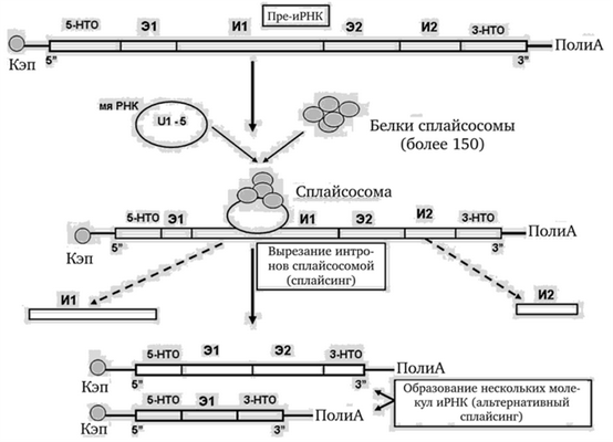 Э1, Э2 — экзоны; И1, И2 — интроны; З-НТО, 5-НТО — нетранслируемые (регуляторные) участки молекулы иРНК; кэп — шапочка; полиА — полиадениловый конец молекулы; Ш—5 — виды мяРНК (малые ядерные РНК), входящие в состав сплайсосомы