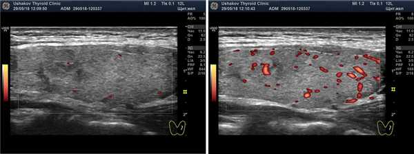В научных и научно-популярных изданиях от Клиники щитовидной железы доктора А.В. Ушакова вы, читатель, никогда не увидите слово «васкуляризация» применительно к описанию реальной ультразвуковой картины. Лишь в качестве подобного пояснения значения терминов для пациентов и специалистов. Грамотно писать и говорить о «кровотоке», то есть об интенсивности и скорости «кровотока» железы.