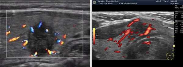 Сосуды узла могут определяться по периметру и внутри узла. Информация о том, что кровоток узла «смешанный» (то есть внутри и вокруг узла) не имеет особой клинической ценности, так как может также часто встречаться как в доброкачественных, так и в злокачественных узлах.