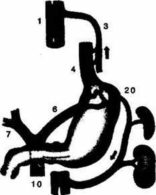 Рис. 2-17. Схемаразвитияпортокавальныханастомозовприциррозепечени (поТонкову). 1 —нижняя полая ве*а 2 — непарная вена, 3 — полунепарная вена, 4 — пищеводная складка, 5 — печень, 6 — левая желудочная вена, 7 — полая вена, 8— селезеночная вена, 9— нижняя брыжеечная вена, 10— верхняя брыжеечная вена, 11 — почечная вена, 12 — вена семенного канатика, 13 — внутренняя подвздошная вена, 14 — средняя прямокишечная вена, 15 — внутренняя ф>*-ная вена, 16 — верхняя надчревная артерия, 17 — поверхностная надчревная артерия, 18 — нижняя надчревная артерив, 19 — околопупочные вены, 20 — гастросупраренальный анастомоз.