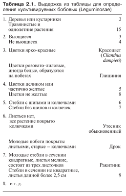 После каждого утверждения стоит число, отсылающее нас к соответствующей ступени; если утверждение, содержащееся на данной ступени, находится в соответствии с внешним видом организма, то стоящее после него число указывает номер той ступени, которую необходимо рассмотреть следующей. Например, если при определении культивируемых бобовых (Leguminosae), включающих горох и фасоль (табл. 2.1), вы пришли к ступени 5 и увидели, что на стеблях растения нет шипов или колючек листового происхождения, то далее необходимо, пропустив ступень 6, перейти к ступени 7 и т. д. (табл. 2.1).