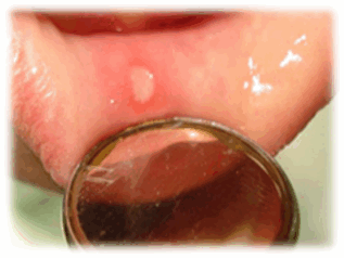 Занесение инфекции осуществляется разными способами, чаще всего – выступает следствием механического повреждения тканей. По мере развития образуются характерные округлые язвы, локализующиеся с внутренней стороны губ и щек, а также в области корня языка.