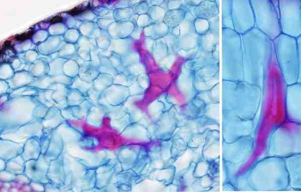 Склеренхима характеризуется наличием двух типов вторичных клеточных стенок, утолщенных и значительно лигнифицированных. На самом деле склеренхимная ткань представляет собой сложную структуру клеток без протоплазмы, которой не хватает жизнедеятельности..