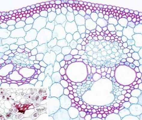 Волокна склеренхимы обнаруживаются в перицикле стеблей, где они образуют тяжи, которые у двудольных примыкают к проводящим пучкам. Часто волокна располагаются в коре под эпидермисом стебля или корня отдельным слоем, так же, как и колленхима, т. е. образуют полый цилиндр, заключающий в себе остальную кору и проводящую ткань. Встречаются волокна — либо по отдельности, либо группами — также в ксилеме и флоэме (разд. 6.2).