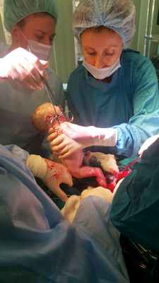 В ходе первого этапа операции — кесарева сечения — извлечена живая недоношенная девочка массой 1940 гр, 43 см, с оценкой по шкале Апгар 6-7 баллов. В ходе второго этапа бригада хирургов определила, что имеет место гнойное расплавление воспалительного инфильтрата стенки сигмовидной кишки. Наиболее частой причиной образования подобных инфильтратов является дивертикулез (воспаление патологического выпячивания стенки кишки). Принято решение о необходимости обструктивной резекции сигмовидной кишки (удаление участка кишки) с выведением колостомы на переднюю брюшную стенку для того, чтобы временно выключить из процесса пищеварения разрушенную гнойным расплавлением часть толстой кишки.