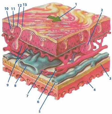 ![]() | 1 – направление мукоцилиарного потока; 2 – слизистая железа; 3 – надкостница; 4 – кость; 5 – вена; 6 – артерия; 7 – артериовенозный шунт; 8 – венозный синус; 9 – подслизистые капилляры; 10 – бокаловидная клетка; 11 – волосковая клетка; 12 – жидкий компонент слизи; 13 – вязкий (гелеобразный) компонент слизи. |