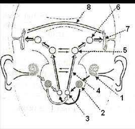 3 – ядро оливы; 4 – латеральная петля; 5 – нижний бугор четверохолмия; 6 – медиальное коленчатое тело; 7 – 41-е поле коры; 8 – мозолистое тело;