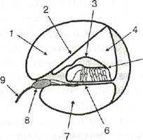 Рис. 14. Схема поперечного разреза канала улитки: 1 – верхний перилимфатический канал (лестница преддверья); 2 – мембрана Рейснера; 3 – покровная мембрана; 4 –улитковый канал с эндолимфой; 5 – кортиев орган с волосковыми клетками; 6 – базальная пластинка; 7 – нижний перилимфатический канал (барабанная лестница); 8 – спиральный узел; 9– начало части слухового нерва