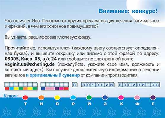 Принимая во внимание этот факт, средством выбора для рациональной терапии БВ следует считать НЕО-ПЕНОТРАН («Шеринг АГ»). Препарат выпускается в форме влагалищных суппозиториев, содержащих в качестве действующих веществ 500 мг метронидазола и 100 мг миконазола нитрата. Доза метронидазола в препарате НЕО-ПЕНОТРАН отличает его от препаратов, имеющих аналогичный состав с более низким содержанием производных имидазола. При применении такой дозы повышается выраженность противомикробного эффекта в отношении анаэробной флоры и трихомонад. Особую ценность представляет возможность назначения препарата НЕО-ПЕНОТРАН при клиническом выявлении вагинита до получения результатов микробиологического исследования. Преимуществами препарата НЕО-ПЕНОТРАН являются также хорошая переносимость, практически отсутствие побочных эффектов, удобство применения. Наш опыт свидетельствует о высокой эффективности препарата НЕО-ПЕНОТРАН при лечении больных с различными формами влагалищной инфекции (Коган Б.Г., Гордеева Г.Д., 2003).