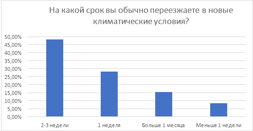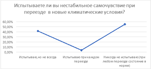 К тому же, в результате было замечено, что 54,9 % участников опроса никогда не испытывают нестабильного самочувствия, их состояние в норме на протяжении всего пребывания в новых климатических условиях.