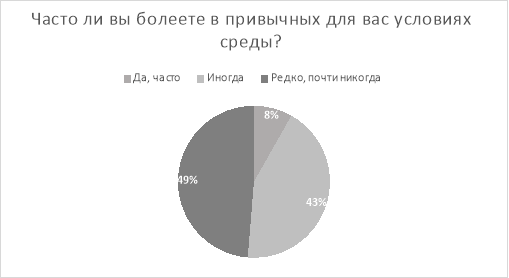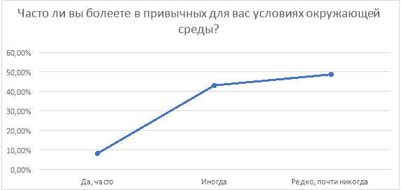 Также выяснилось, что 43,1 % опрошенных людей в привычных условиях среды болеют иногда, а 48,7 % никогда не болеют в месте своего постоянного проживания.