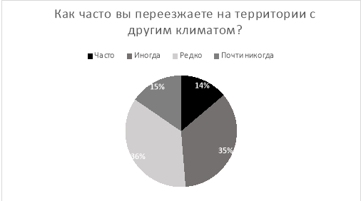 34,5 % респондентов иногда переезжают на территории с другими климатическими условиями. При этом 35,9 % опрошенных переезжают редко. Но все же основная масса людей испытывает на себе смену климата, ведь только 15,5 % опрошенных на протяжении всего времени остается в привычных для них условиях среды (в месте постоянного проживания) или переезжает на небольшие расстояния, при которых смена климата наименее заметна или незаметна совсем.