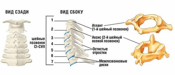 Шейный отдел состоит из семи позвонков . Каждый из них отличается по своему строению. По причине их небольших размеров и слабости мышц шеи данный отдел нередко подвергается травмированию.