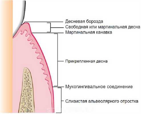 Клинически различают: свободную (маргинальную, краевую) десну шириной примерно 1,5 мм, прикрепленную десну, ширина которой варьирует и межзубную десну.