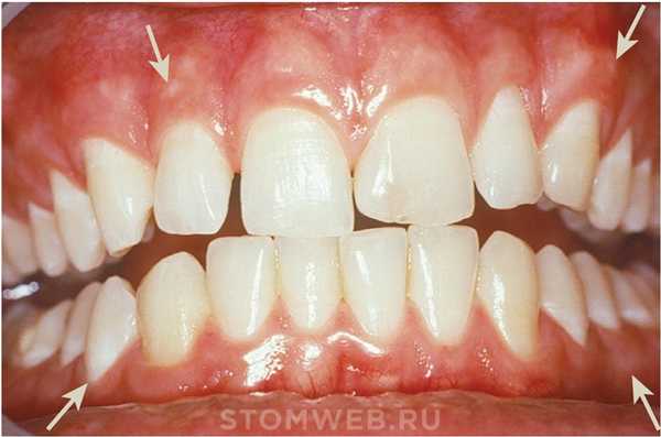 Рисунок 2-1 Нормальная десна у молодого взрослого человека. Обратите внимание на разграничение (мукогингивальная линия) (стрелки) между прикрепленной десной и более темной альвеолярной слизистой оболочкой.