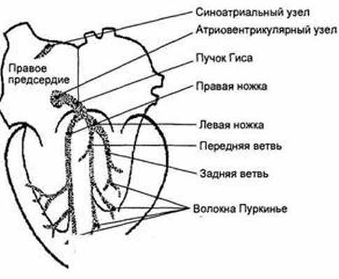 Для того чтобы сердце сокращалось ритмично, оно должно иметь водитель ритма (клетка или группа клеток возбудимой ткани, способных генерировать ритмические импульсы возбуждения, распространяющиеся на другие клетки), а также средства последующего проведения этих импульсов. Главный водитель ритма сердца - синусно-предсердный узел, второстепенный - предсердно-желудочковый узел, передающий возбуждение от синусно-предсердного узла на предсердно-желудочковый пучок (пучок Гиса). Последний в дальнейшем разделяется соответственно желудочкам сердца на левую и правую ножки. После прохождения импульса по всем этим путям и возбуждения всех отделов сердца электрические процессы претерпевают «обратное развитие» и «электрическое» состояние сердца возвращается в исходное положение.