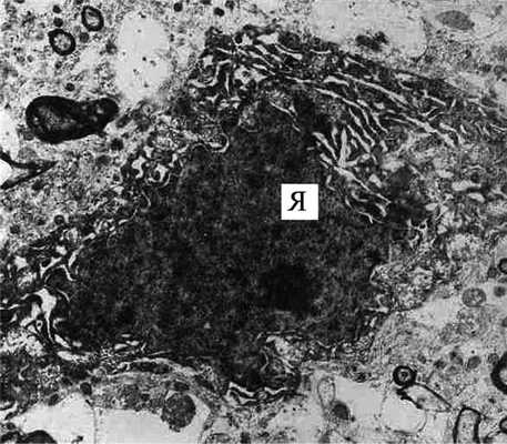 Рис. 5. Пикнотизированный нейрон из СХЯ. Здесь и на рис. 6: Я - ядро. Ув. 3000.