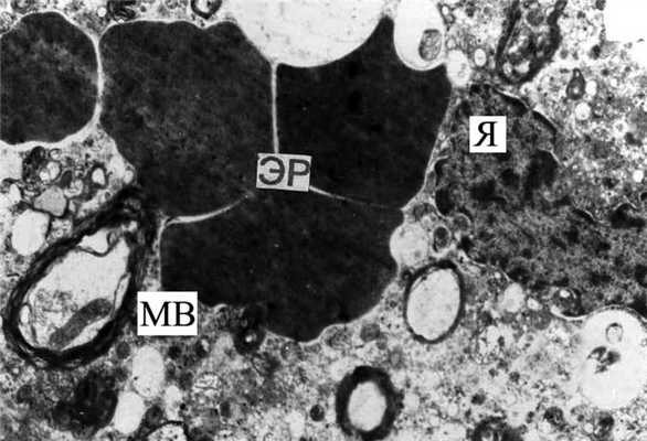 Рис. 4. СМК крысы после ДС. ЭР - свободные эритроциты в ткани мозга, окруженные миелиновыми волокнами (МВ) с выраженной миелино- и аксонопатией. Справа - нейрон с ядром (Я) в состоянии кариорексиса. Ув. 8000.