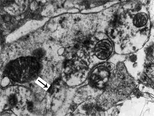 Рис. 8. Аксодендритический (стрелка) и дендродендритический синапсы СОЯ. Ув. 20 000.