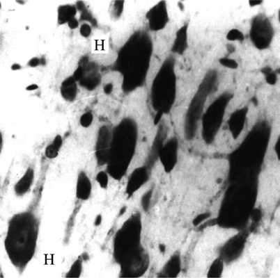 Рис. 3. СМК крысы после ДС (световая микроскопия). Нейроны в состоянии набухания (Н). Окраска по методу Ниссля. Ув. 250.