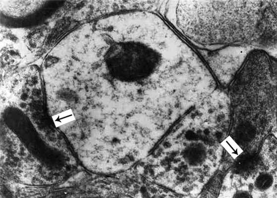Рис. 7. Аксодендритические синапсы СХЯ (стрелки). Ув. 20 000.